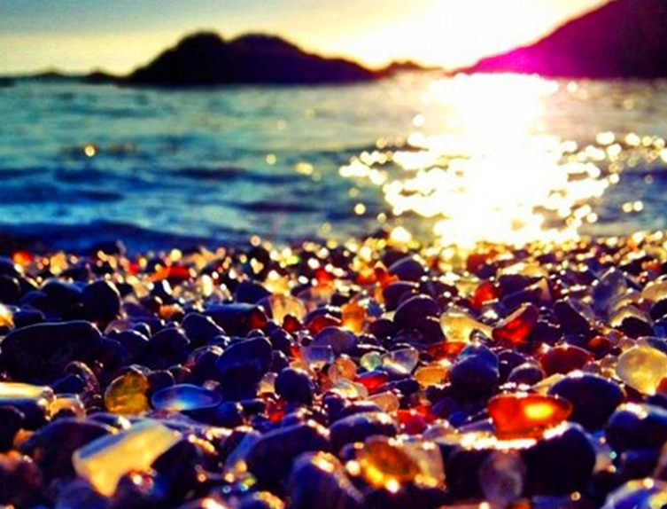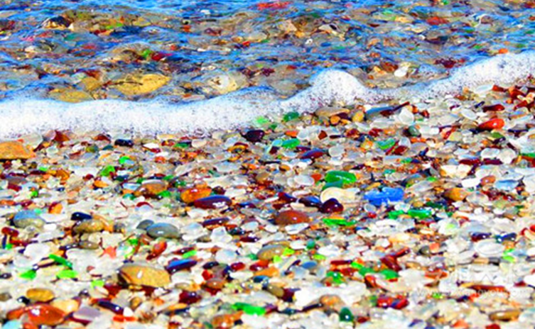 在美国加州的布拉格堡有这样的海滩。这里原本是丢垃圾的地方,但19世紀60年代,居民们打算将垃圾回收清理时却发现,埋在下面的很多垃圾,被大自然的力量改变成各种颜色的石头,许多犹如玻璃般透亮!