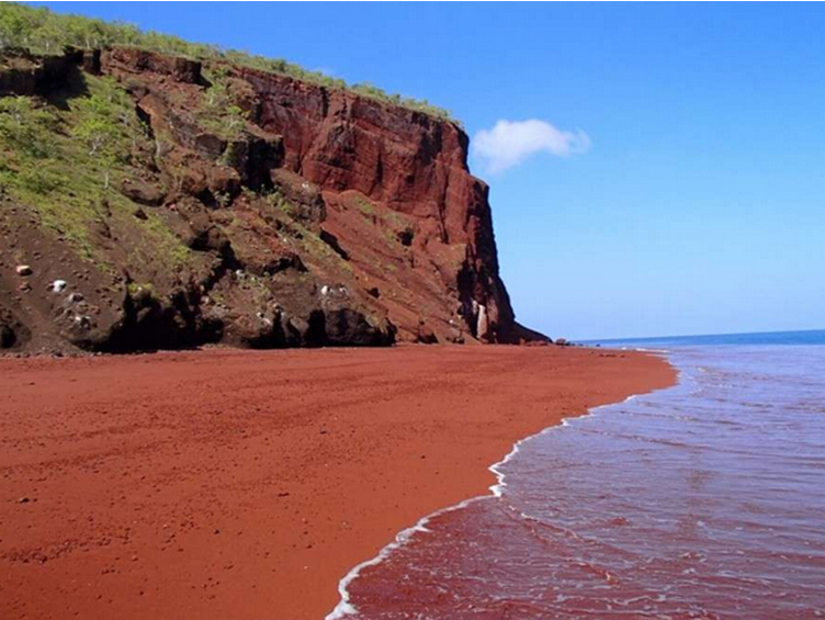 火山岩和大型铁矿受到海水侵蚀而形成。世界上主要有三个红色沙滩,分别在希腊、夏威夷、加拉帕戈斯群岛。