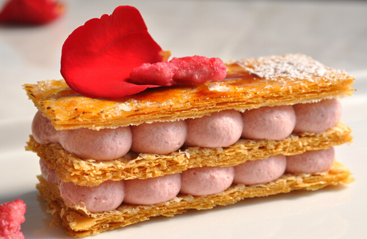 酥皮的制作过程极其繁复,起酥用到的大量动物性黄油遇体温即熔化,难以控制,一般这是最考验师傅功底的项目。另外有意思的是甜点的名字其实与拿破仑没什么关系。你可以想像法国人对拿破仑的崇敬和爱,就知道这款甜品对他们的意义了。拿破仑蛋糕配上新鲜浆果最理想,清新的草莓,酸甜的覆盆子,令味道更加香甜。