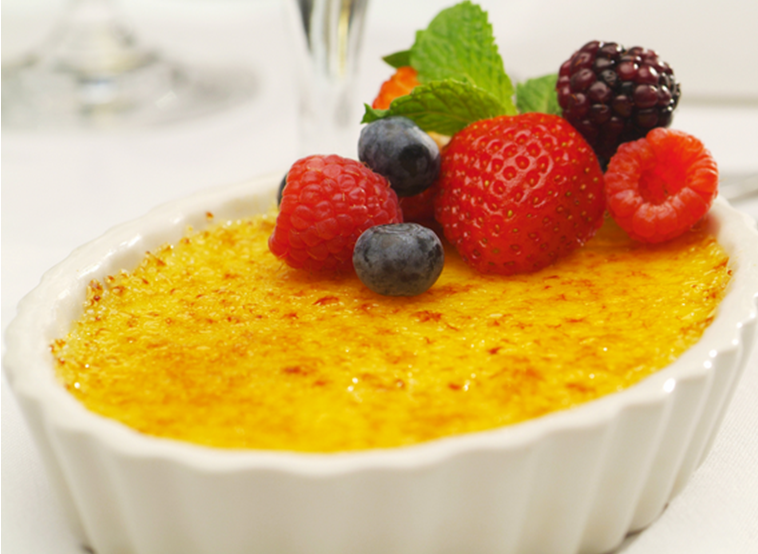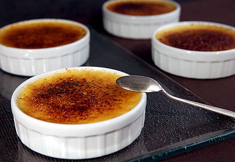 焦糖布丁是另一著名的法式甜品,Creme是奶油的意思,Brulee则是刚烘烤过的意思。上层是琥珀色酥脆的焦糖,吃时用小银勺轻敲表面,焦糖片破碎,下面热热的蛋奶布丁和焦糖片一起入口,醇香滑嫩,妙不可言。做这款甜品的关键是掌握火候和蛋奶比例,焦糖要恰到好处,冷藏之后亦是另一番风味。