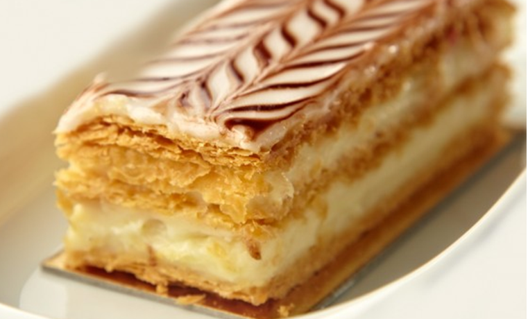 拿破仑的法语意思是“一千层”,所以也叫千层酥。一共三层焦黄色的千层酥皮,中间涂满馥郁香甜的香草奶油和卡仕达酱(也叫蛋奶油,Custard),千层酥入嘴便碎,黄油浓香满口乱窜,幸福感不过如此。