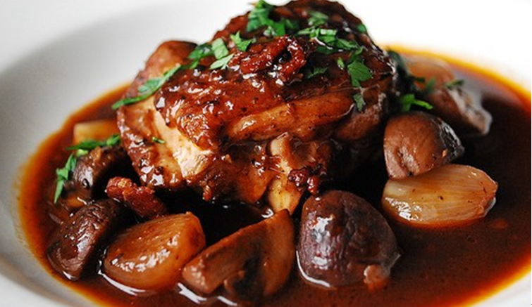 法式红酒烩鸡,这几乎是最有名的法国菜之一。起初是使用公鸡烹制,而现在通常会用普通的鸡肉放在黄油,培根,牛肉汤,红酒调和的酱料一起烹制。如果可以的话,来一杯勃艮第的黑皮诺。巧克力慕斯来收场这次盛宴。
