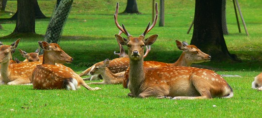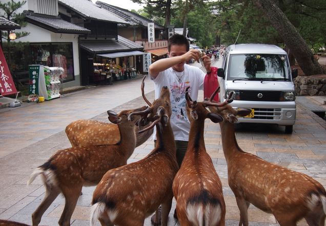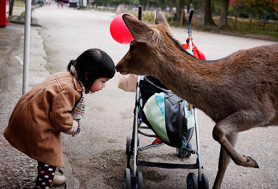 在人口不过30万的古都奈良街头,徜徉着超过1000头鹿,而且全部都是野生的。奈良不是属于人类的地方,一进入浓密的林荫道就能嗅出异样。这里是鹿,到处都是鹿。他们或者悠闲的散步,或者安然的端坐晒太阳,或者也会走进小镇走入人们的生活里。