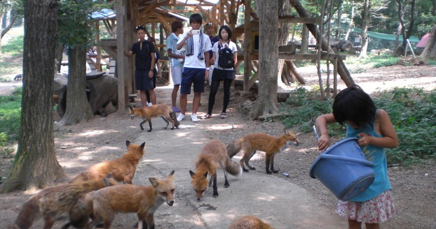 穿过一道大门就来到狐狸村的主体区域,狐狸在里面自由行走。树林和灌木随处可见,恍然以为自己到了野外。这里没有“禁止喂食”的扫兴标语,花不多的钱便能买上一包饲料喂食。有些狐狸见到你会好奇地向你冲来,还有的被吓得跑走。尽情享受狐狸的各种无节操卖萌吧。