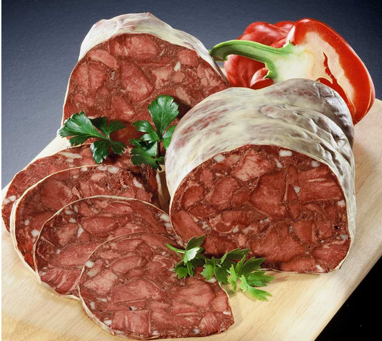 德国以其1500多种的香肠世界闻名,其中有一种叫做血肠。这种香肠是用动物血、动物舌条、面包屑和燕麦混合制作而成,而肉冻取自猪舌或是牛舌,香肠经过特殊处理可以直接食用,但当地人更喜欢切片加黄油煎着吃。