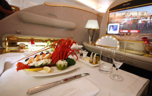 在阿航的头等舱就餐,等待你的是7道菜的豪华餐!所有餐食都用骨瓷餐具盛装,餐具摆放在优质亚麻布垫上,并用花卉装饰。即使是经济舱,也会有烟熏吞拿鱼配卤汁蔬菜色拉、香烤羊肉串配西兰花、烤玉米笋与米饭,还有枣蓉布丁、巧克力、芝士和饼干,以及白兰地将逐一为你呈上。