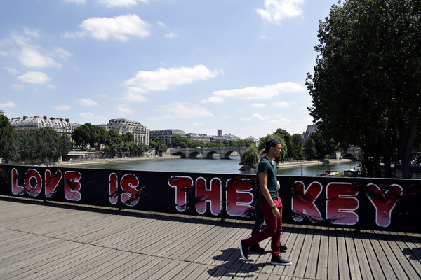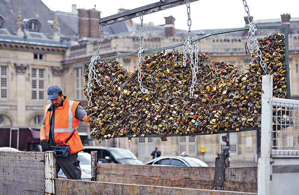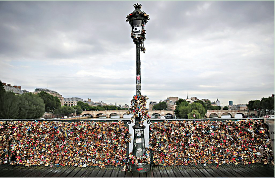 桥上原本挂满数十万个“爱情锁”,世界各地的情侣来到这里将锁挂在护栏上,再把钥匙丢入塞纳河里,象征着两个人永恒不朽的爱情。
