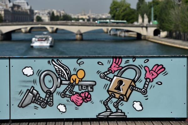 政府就这样强拆下别人的爱情锁,心里或许也不好受。于是在拆的过程中,请涂鸦艺术家们绘上了"Love is the key (爱情才是钥匙)"之类的字并配上图片。仿佛在说:"少挂点锁,多多保鲜你们的爱情吧!"