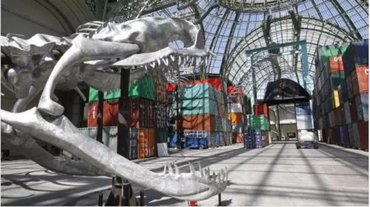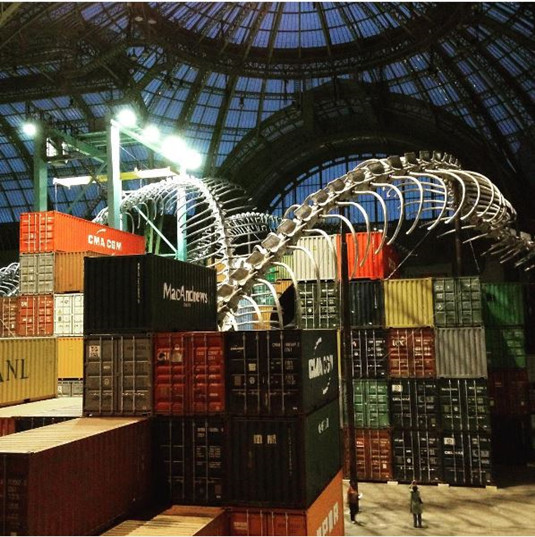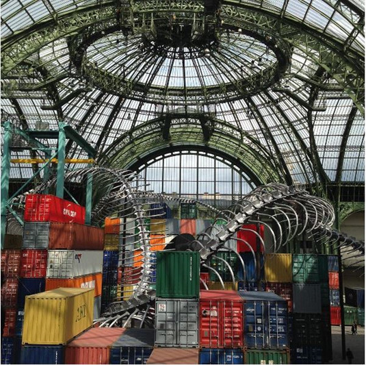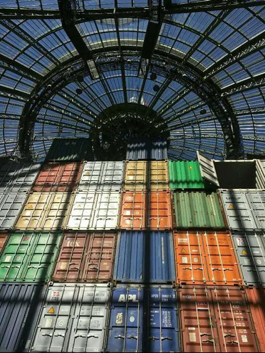展览里的集装箱主要来自于世界第三大集装箱集团---法国CMA-CGM集团,而且它们呈现很多不同的颜色,也印有不同的文字,很好的代表了跨国物流的交换。大皇宫大殿法语是Nef de Grand Palais,“nef”在法语古意有中世纪的大帆船一意。黄永砅表示,整个展览大厅很像一艘翻过来的船,承载这些集装箱从世界的一个地方到另一个地方。