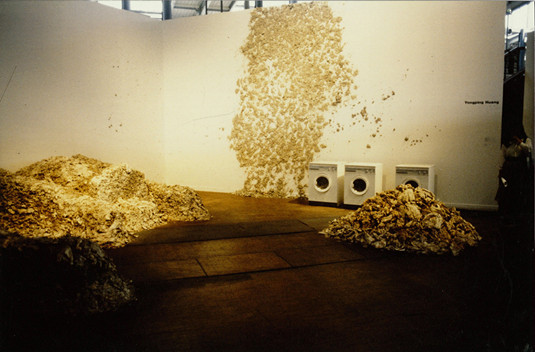 ▲ 1989年“大地魔术师”展览中黄永砯的装置作品---在洗衣机中清洗的书籍图片来源:亚洲艺术文献库