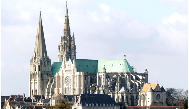 雄伟的沙特尔圣母大教堂是中世纪哥德式建筑的辉煌,占地2500平方公尺,建造以来启发了不少的信徒,甚至因为它的魅力,让人收回了对信仰的质疑。1979年被列为世界文化遗产。璀璨的彩色玻璃窗让七彩光芒渗透入大点,营造了空灵的氛围,其中大部分的窗棂历史都可以追溯到13世纪,无不透露出惊人的绘画手艺,有其是玫瑰窗的描绘非常精致美丽。