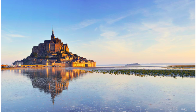 圣米歇尔山像海中金字塔坐落在岩石小岛上,被城墙环绕着,每当涨潮就会变成一座孤立的小岛,而退潮就可以步行沙滩直奔圣米歇尔山。岛上主要观光景点是圣米歇尔修道院,作为中世纪的建筑奇迹,这座哥特式建筑是重要的朝圣地,有着天上耶路撒冷的美名。