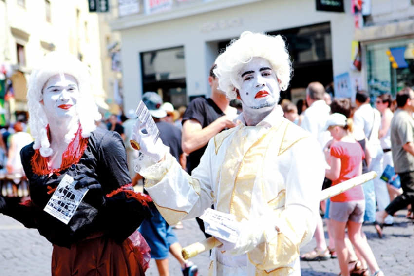阿维尼翁非常小,基本上半天的时间就可以走遍城市的大街小巷,从中央火车站下车,沿着正对火车站大门的主干道共和国大街一路上可以看到各种艺术家的表演,走到圆形的广场可以看到位于一侧的阿维尼翁剧院THé?TRE MUNICIPAL,是戏剧节的重要室内表演场所之一。几乎每一天都会有相关的记者招待会。