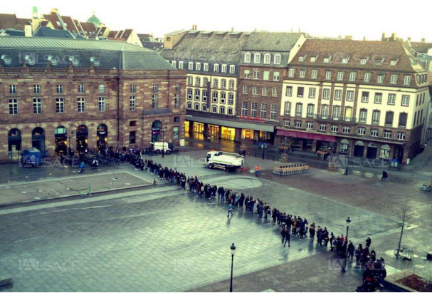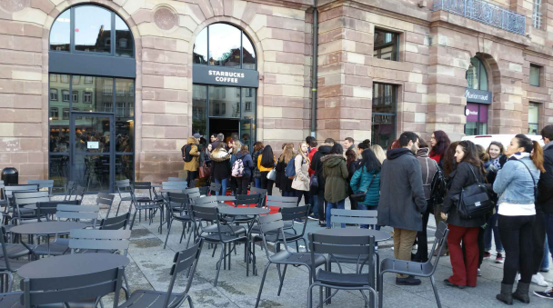 然而法国人也并没有像意大利一如既往的强烈抵制星巴克的入驻。随着这几年游客的增多,加之青少年对国外文化的接纳,旅游性城市如 巴黎、里昂、马赛、尼斯、斯特拉斯堡等都已经有星爸爸的存在了。就在今年四月,斯特拉斯堡的星巴克开张,于是出现了以下一幕: