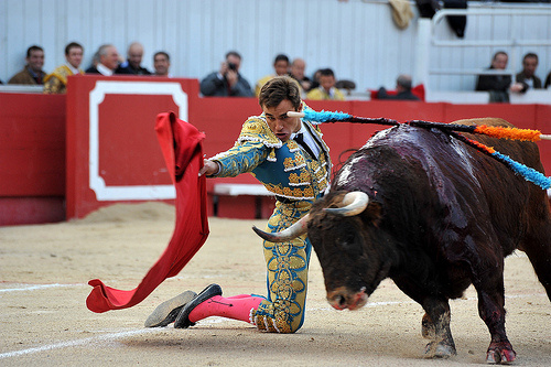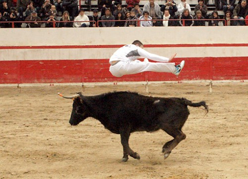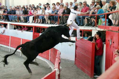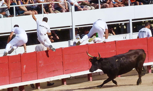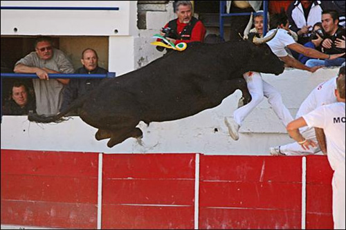 公牛在跑动,甚至试图攻击斗牛士,斗牛士必须在保护自身安全的同时扯下绳带。而斗牛士们“自保”的唯一设施是围绕竞技场的一圈高1.3米的木板。为了躲避公牛,斗牛士们经常飞身跃上木板、跳向观众席或者跃入木板和观众席之间的区域。这时,观众席里一定会爆发出一阵为斗牛士的“杂技表演”的喝彩声。这也是卡马尔格式斗牛的魅力所在。