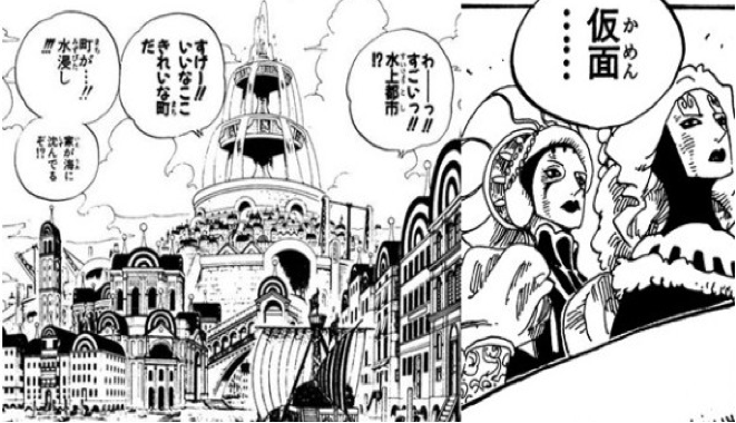 路飞在水之七岛与弗朗吉基相遇,原型即意大利水城威尼斯,还表现了独特的威尼斯面具。