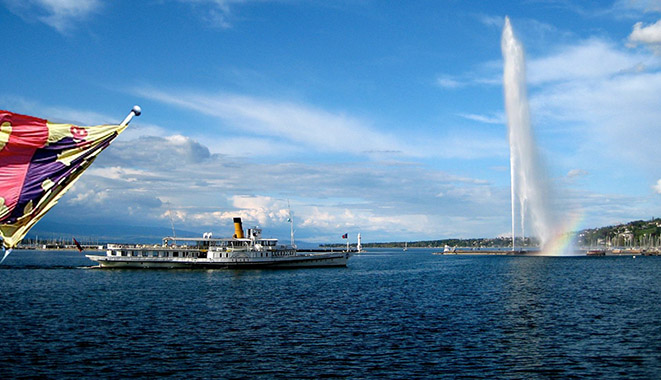 湖上的游船, 绕湖一周要十二个小时, 缓慢的船速让游人得以轻松地欣赏湖景甚至用餐。不过建议你随便选乘一小段,体会一下湖光山色的浪漫即可。日内瓦喷泉,位于日内瓦湖上。地址:QUAI GUSTAVE-ADOR, GENEVE