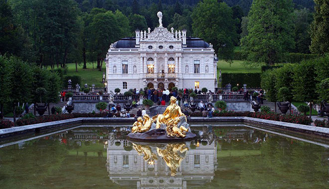 路德维希二世最喜欢的林德霍夫宫(Schloß Linderhof),是洛可可式建筑中的一件珍品,也是路德维希的诸多王宫中唯一完工的一座。在林德霍夫宫周围分布着风格各异的意大利、法国和英国园林,园林内点缀着喷泉、池塘和华而不实的观赏建筑,堪称那位古怪国王的珍宝箱。