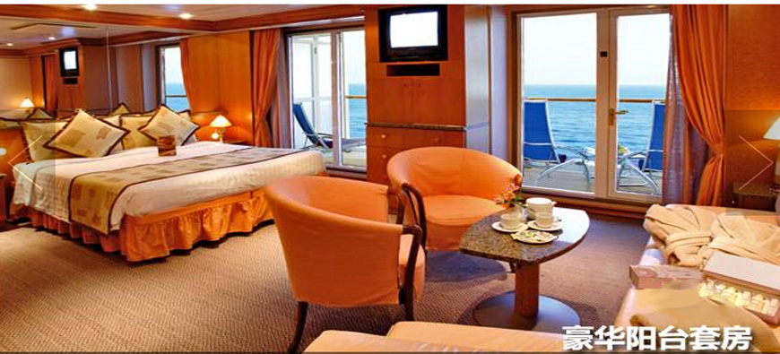 套房设施:除了房间服务,还包括完整的套房内餐饮服务,起泡酒,冷小吃,每日新鲜水果篮和贵宾待遇,优先办理上下船手续,协助打包和拆包,提升卫浴产品,邀请贵宾酒会,船上的两个特色餐厅享用免费晚餐。