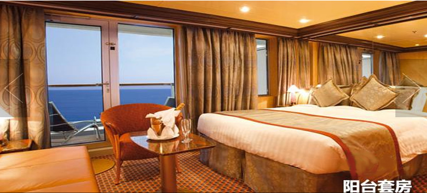 客房简介:客舱内有落地窗直达私人阳台,两张单人床其中大部分可转换位大号床,衣柜空间大,带淋浴的私人浴室,会客区,沙发。每个包厢夜有自己的互动电视,卫星,恒温控制空调,直拨电话,吹风机,迷你酒吧,个人保险箱,免费欧陆式早餐及24小时客房服务。