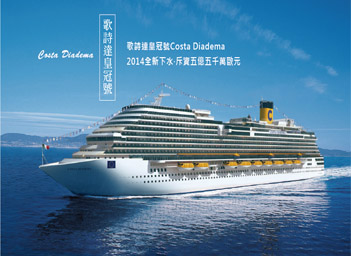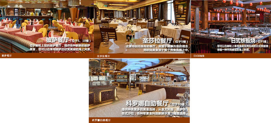 钻石皇冠号是歌诗达邮轮中文覆盖最全的邮轮, 邮轮上遍布中文导航,中文宣传册,饭店提供中文菜单,并且邮轮上有大量的讲中文的服务人员。