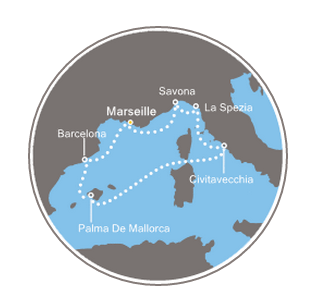 马赛是法国第二大城市,为居民和游客提供非同寻常的海岸地区,自然遗产无以伦比,众多的公演堪称名副其实的绿肺,众多的旅游景点,12座博物馆陈列着从古代到当代艺术作品的各种收藏。在马赛不容错过从守护圣母教堂(Notre-Dame-de-la-Garde)欣赏全貌。探访小渔港、小海湾、伊夫堡(château d’If)以及弗里乌尔群岛(archipel du Frioul)。流连于马赛的各个集市。在老港(Vieux-Port)的夕阳下啜饮一杯茴香酒。在老济贫院美术馆(Vieille-Charité)观看一次展览,并且在篮筐街区(quartier du Panier)漫步徜徉。在韦洛德罗姆体育场(Stade-vélodrome)观看一场比赛。在海滨大道慢跑。品尝美食特色:马赛鱼汤(bouillabaisse)、羊蹄和羊肚卷(piedset paquets)、船型饼干(navettes),等等。离港:17:00