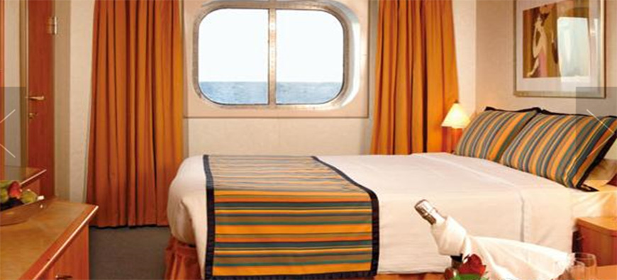 客房简介:客舱内有两张单人床大部分可转换位大号床,衣柜空间大,带淋浴的私人浴室,还有书桌,梳妆台,沙发休息区以及可观望海景的窗口。每个包厢也有自己的互动电视卫星,空调,电话,吹风机,迷你酒吧,个人保险箱,免费欧陆式早餐及24小时客房服务。