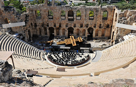 卫城建筑群中的迪奥尼苏斯剧场,奇妙之处在于其音响效果,在巨大的半圆形剧场的边缘,观众仍然可以和前排的观众一样清楚地听到演员轻微的叹息声。该剧场已历经2000年风雨,至今仍在使用。