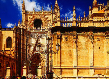 塞维利亚大教堂是一座哥特式的大教堂,由墙顶部带许多柱的围墙环绕屋顶上向上耸立的尖塔而成的建筑。大教堂的正门面对国王圣女广场,有5个正厅(主厅高36米),它的主体是116米长76米宽的矩形建筑。最高处的十字架高达40米。教堂共有三扇大门:正门为王子之门,其余分别为洗礼之门,亚松森门。