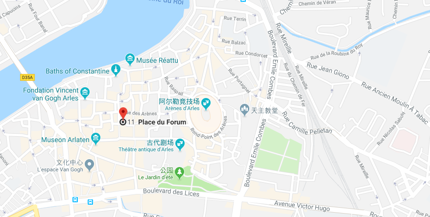 梵高咖啡馆(Cafe La Nuit /Le Cafe Van Gogh)位于角斗场以西,走到共和国广场,穿过市政厅里的通道,继续向北是弗洛姆广场(Place du Forum),它也因为梵高的《夜晚露天咖啡座》而让游客流连忘返。也正是在此地是由文森特·梵高于1888年9月创作的一幅画布油彩画《夜晚露天咖啡座》,原作现收藏于荷兰的奥特罗克罗勒-穆勒博物馆。